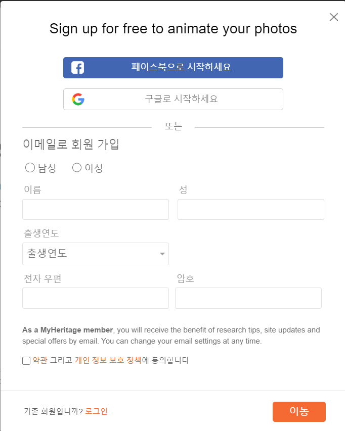 사진을 업로드하기 전에 MyHeritage 계정을 생성하라는 메시지가 뜹니다. 계정을 만들지 않으면, 이 서비스는 사용할 수 없으니 페북이나 구글, 또는 이메일로 회원가입을 통해서 계정 등록을 합니다.