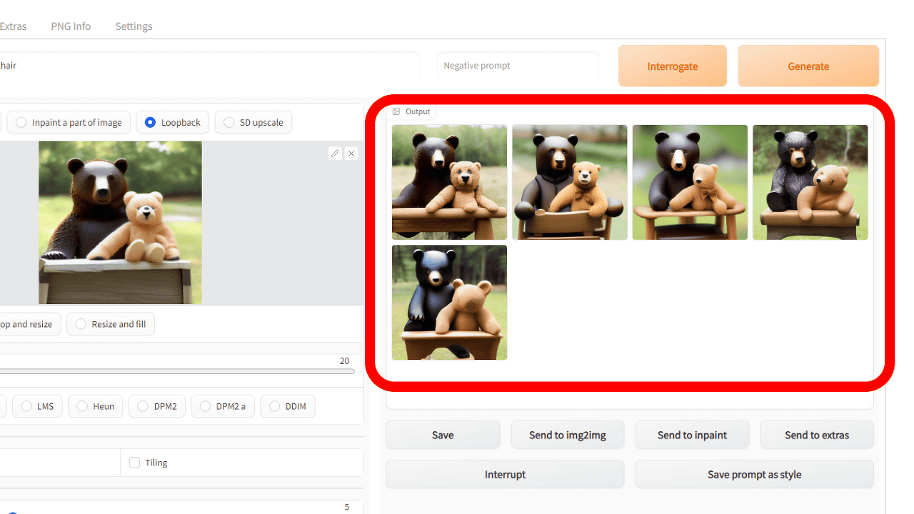 img2img는 「입력한 이미지와 프롬프트를 기초로 새로운 이미지를 생성한다」라는 것입니다. 그래서 "img2img로 출력한 이미지를 img2img의 새로운 입력 이미지로 하여 같은 프롬프트로 추가 이미지를 생성한다"는 것입니다. 이렇게 출력 이미지를 img2img에 여러 번 피드백시켜 이미지를 생성하는 기능이 "루프백"입니다.