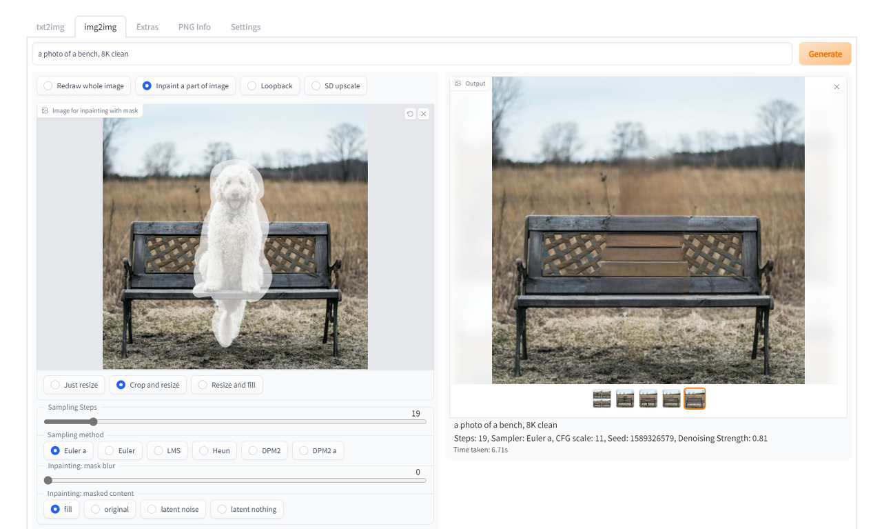 Inpainting의 처리는 「full」,「original」,「latent noize」,「latent original」의 4종류가 준비되어 있습니다. 처리 방법을 선택하고 Denoising strength를 조정하고 Generate를 클릭합니다. Denoising strength는 Stable Diffusion의 기계 학습 알고리즘에 있어서의 노이즈 제거의 강도를 나타내는 것으로, 어느 정도의 조정이 필요합니다. 이번에는 Denoising strength를 0.2로 설정했습니다.