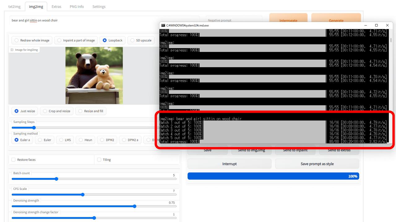 Loopback은 'img2img' 상단의 'Loopback'을 체크할 수 있습니다. 이미지와 프롬프트를 입력한 후 Batch size에서 루프 횟수를 결정하고 Generate를 클릭합니다.