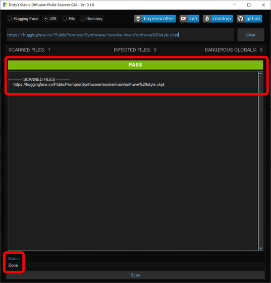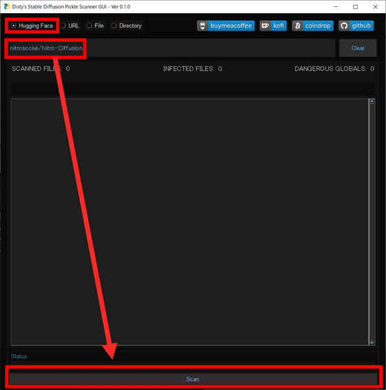 예를 들어 "URL"을 선택하고 README에 예시된 URL "https://huggingface.co/PublicPrompts/Synthwave/resolve/main/snthwve%20style.ckpt"를 확인하려면 아래의 빈칸에 입력하고 화면 하단에 있는 "Scan"을 클릭하시면 됩니다.