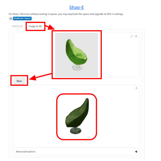 또한 Sharp-E는 이미지에서 3D 모델을 생성할 수 있는 "Image to 3D" 모드도 탑재되어 있습니다. 「Image to 3D」의 탭을 클릭해, 3D 화하고 싶은 이미지를 읽어 들여, 「Run」을 클릭하면 됩니다. GitHub의 생성예에 있는 「A chair that looks like an avocado(아보카도와 같은 외형의 의자)」의 생성예의 정지화면 이미지를 읽혀 보았더니, 원래의 3D 모델에 가까운 것이 생성되었습니다.